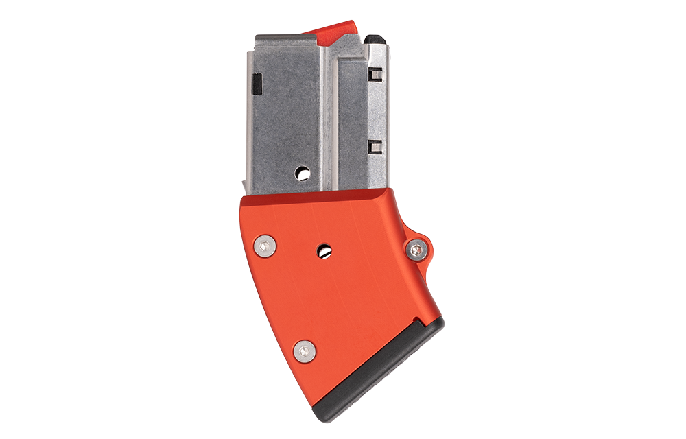 Der Magazinboden besteht aus hochfestem, witterungsbeständigem Aluminium und ist in einer auffälligen roten Ausführung gestaltet. Dadurch wird nicht nur die Haltbarkeit erhöht, sondern auch eine moderne und markante Optik erzielt. Durch die einreihige Bauweise können die Patronen zuverlässig und gleichmäßig zugeführt werden.