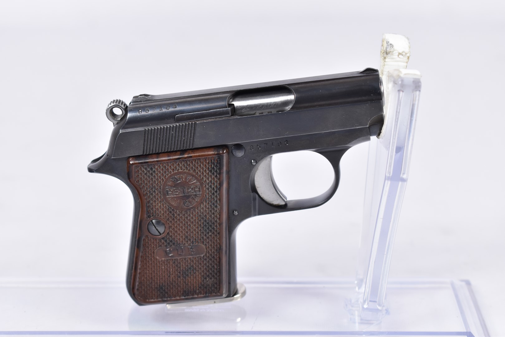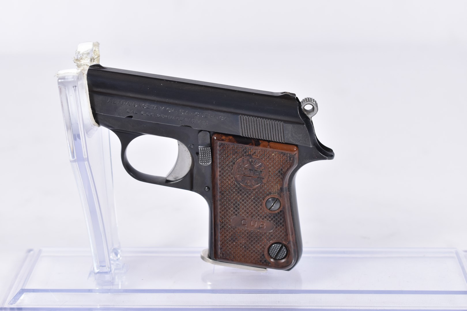 Diese Astra Pistole im Kaliber 6,35mm Browning hat eine Gesamtlänge von 11,5 cm und eine Lauflänge von 5,5 cm. Sie wiegt 375 g und befindet sich im Zustand 2, was leichte Gebrauchsspuren bedeutet. Die Pistole ist mit Bakelitgriffschalen ausgestattet und wird ohne gültigen Beschuss, aber mit Originalkarton, Bedienungsanleitung und einem zusätzlichen Magazin geliefert.