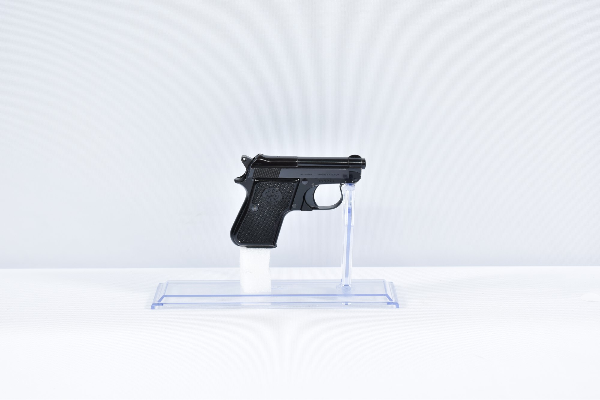 Diese Beretta 950B Pistole im Kaliber .22 Short hat eine Gesamtlänge von 12 cm und eine Lauflänge von 6 cm. Sie wiegt 330 g und befindet sich im Zustand 3-4, was starke Gebrauchsspuren mit deutlichen Kratzern bedeutet. Die Pistole ist mit Kunststoffgriffschalen ausgestattet und verfügt über einen gültigen italienischen Beschuss.