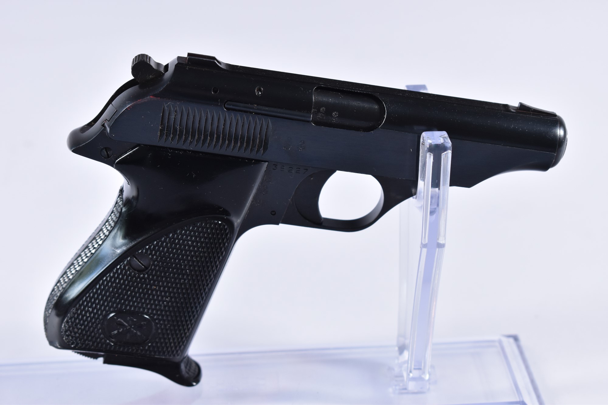 Diese Bernadelli 60 Pistole im Kaliber .22lr hat eine Gesamtlänge von 17 cm und eine Lauflänge von 9 cm. Sie wiegt 690 g und befindet sich im Zustand 2-, was bedeutet, dass sie leichte bis mittlere Gebrauchsspuren aufweist. Die Pistole ist mit Bakelitgriffschalen ausgestattet und verfügt über einen gültigen Beschuss. Sie wird mit dem Originalkarton sowie einem zusätzlichen Magazin und Zubehör geliefert.