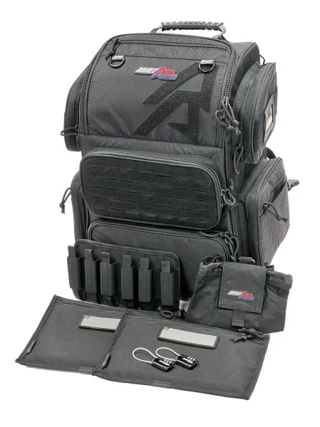 Lieferumfang: Zwei Pistolentaschen mit abschließbaren Reißverschlüssen und beschreibbaren Namensetiketten, ein herausnehmbarer sechsteiliges Magazinhalter, eine große Messingtasche, zwei Kombinationsschlösser, ein Regenüberzug mit elastischem Halt.