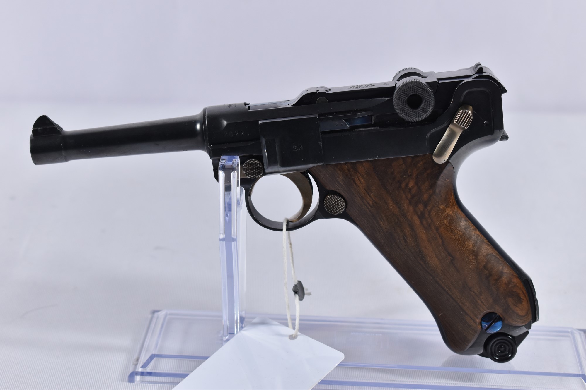 Diese Deutsche Waffen- und Munitions 08 Pistole im Kaliber 9mm Luger hat eine Gesamtlänge von 22 cm und eine Lauflänge von 10 cm. Sie wiegt 0,876 kg und befindet sich im Zustand 2, was normale Gebrauchsspuren bedeutet. Die Pistole ist mit Holzgriffschalen ausgestattet und wurde 1915 hergestellt, jedoch ohne gültigen Beschuss. Die Abgabe erfolgt an Händler oder Sammler.