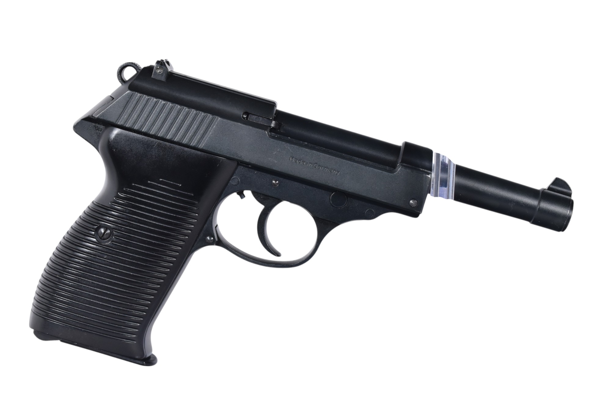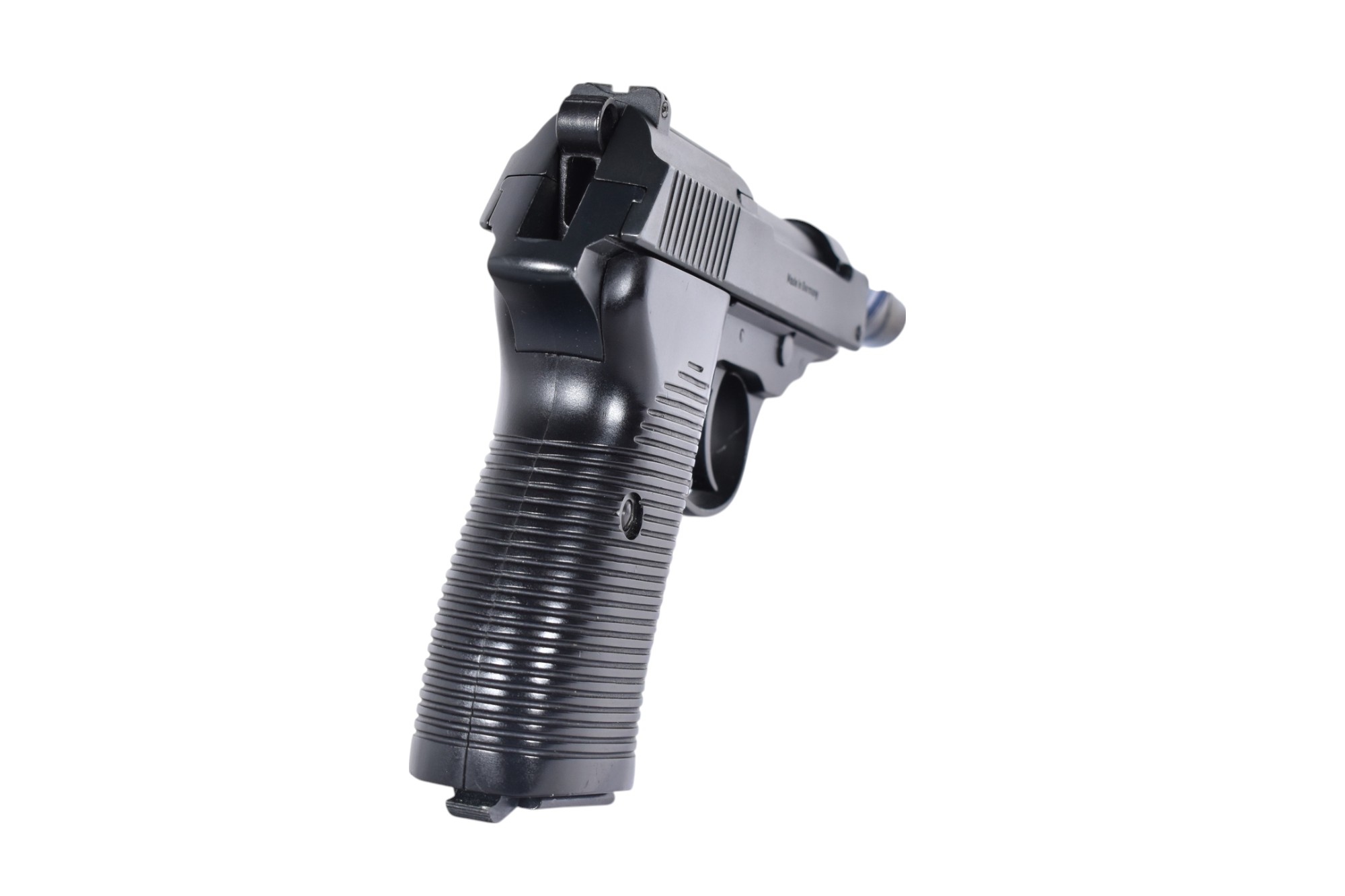 Diese Erma EP 882 im Kaliber .22lr ist eine kompakte Pistole mit einer Gesamtlänge von 12,5 cm. Sie verfügt über eine Schlagbolzensicherung und ist mit Kunststoffgriffschalen ausgestattet.