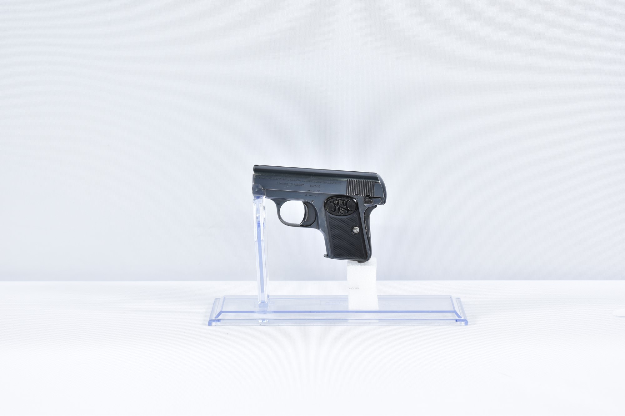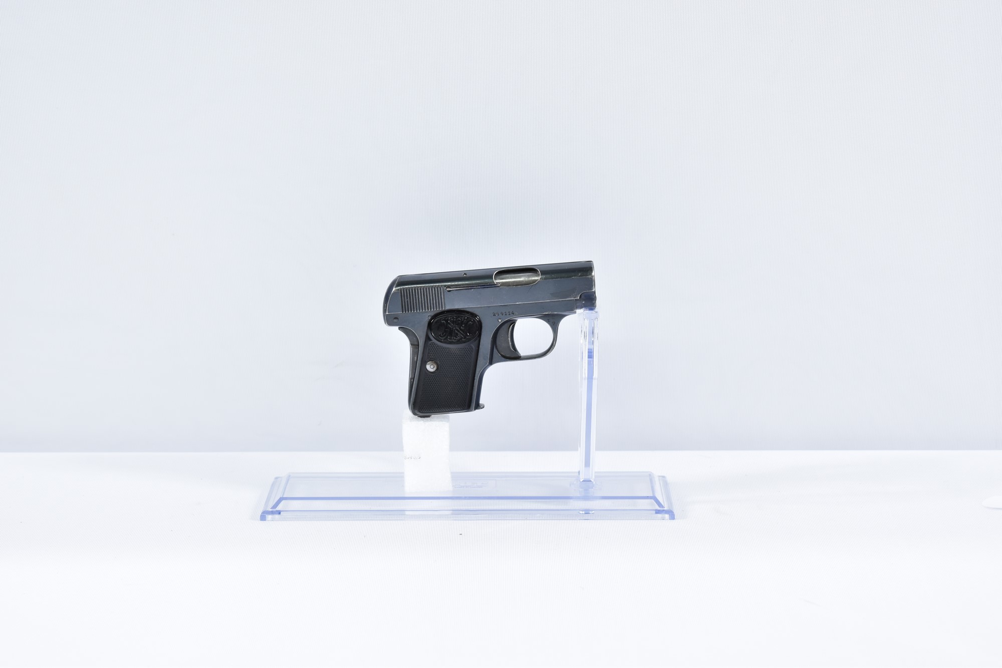 Diese FN 1906 Pistole im Kaliber 6,35mm hat eine Gesamtlänge von 11,5 cm und eine Lauflänge von 5,5 cm. Sie wiegt 0,37 kg und hat eine Magazinkapazität von 5 Schuss. Der Zustand der Waffe wird als 2 eingestuft, was normale Gebrauchsspuren, leichte bis mittelstarke Dellen und/oder leichte Kratzer an der Brünierung bedeutet, mit normaler Schussbelastung. Die Schäftung besteht aus Kunststoff.