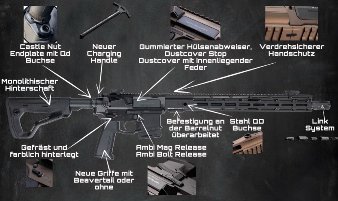 Der gummierte Hülsenabweiser mit innenliegender Feder sowie der Dustcover Stop bieten eine erhöhte Funktionalität und Langlebigkeit. Der ergonomische Griff ist wahlweise mit oder ohne Beavertail verfügbar. Weitere Optimierungen umfassen eine gefräste und farblich hinterlegte Sicherung sowie eine Castle Nut Endplate mit QD-Buchse für eine verbesserte Schulterstützenbefestigung.