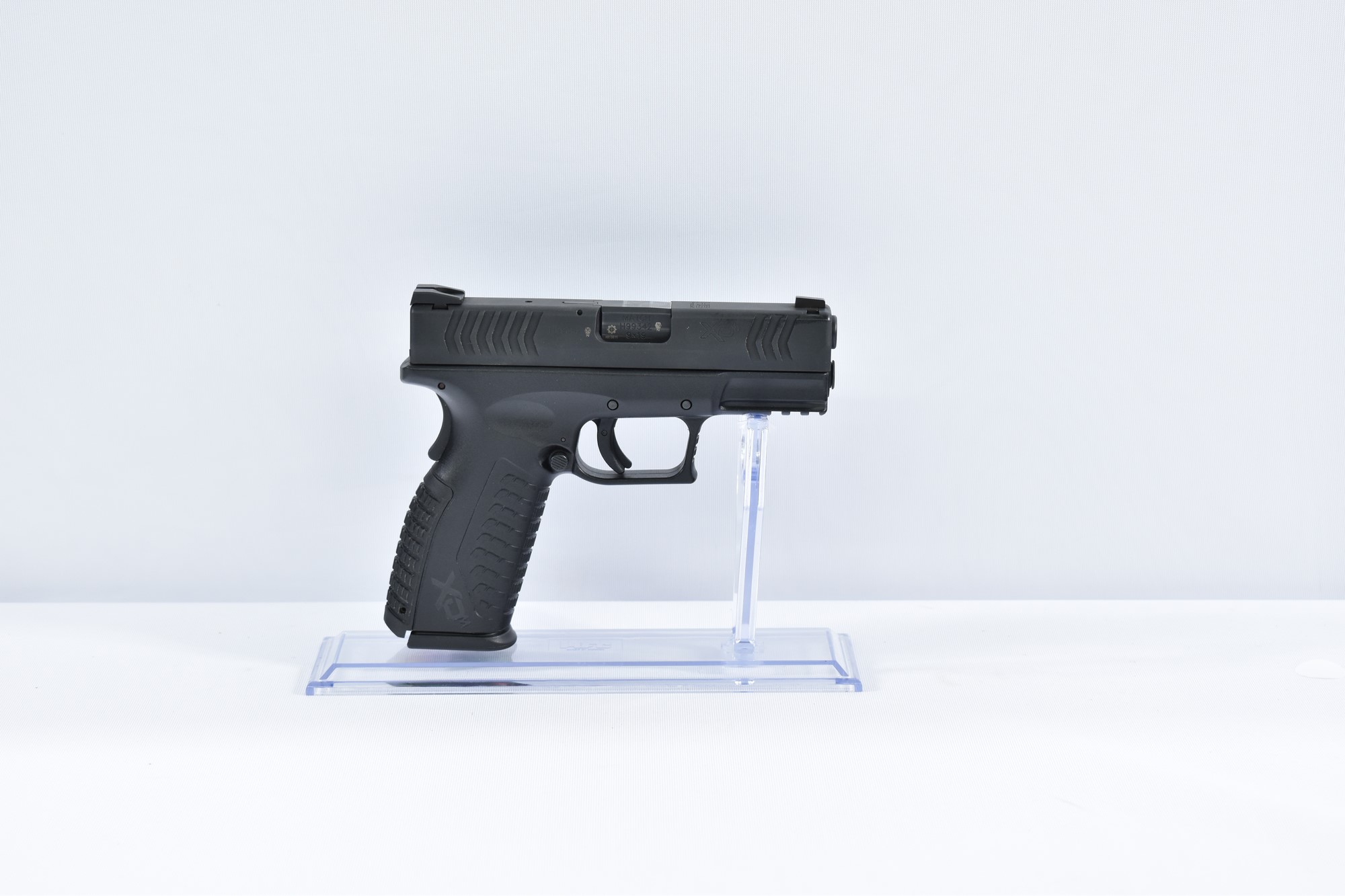 Diese HS Produkt XDM9 3,8 Pistole im Kaliber 9mm Luger hat eine Gesamtlänge von 16,5 cm und eine Lauflänge von 9,5 cm. Sie wiegt 0,8 kg und verfügt über eine Magazinkapazität von 18 Schuss. Die Griffschalen sind aus Kunststoff gefertigt. Der Zustand der Pistole wird als 1-2 bewertet, was sehr leichte Gebrauchsspuren oder eine geringe Schussbelastung bedeutet. Sie wird mit einem Ersatzmagazin, Koffer und Zubehör geliefert.