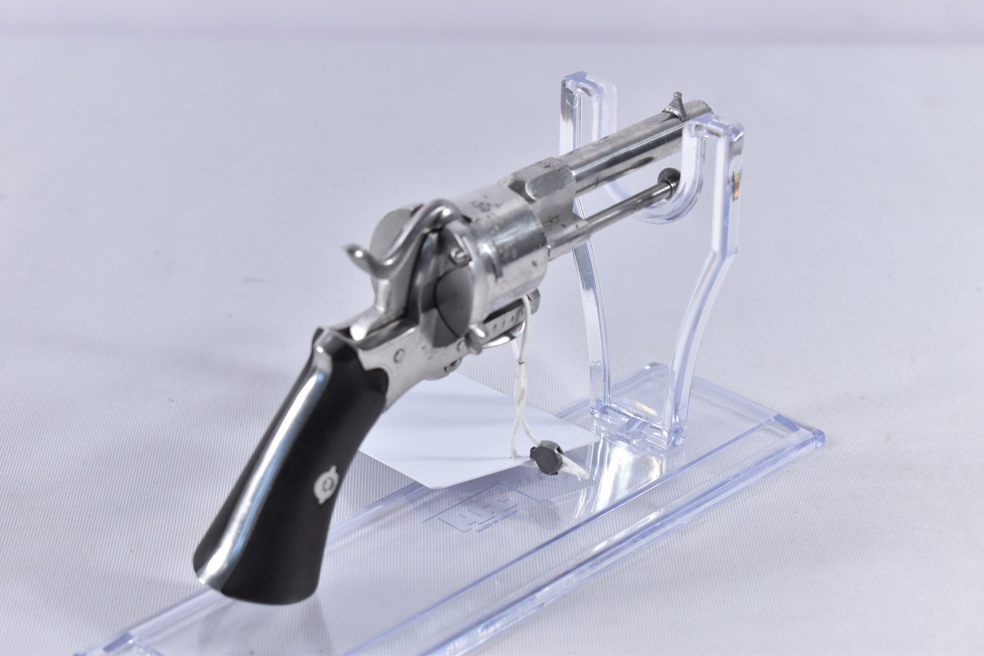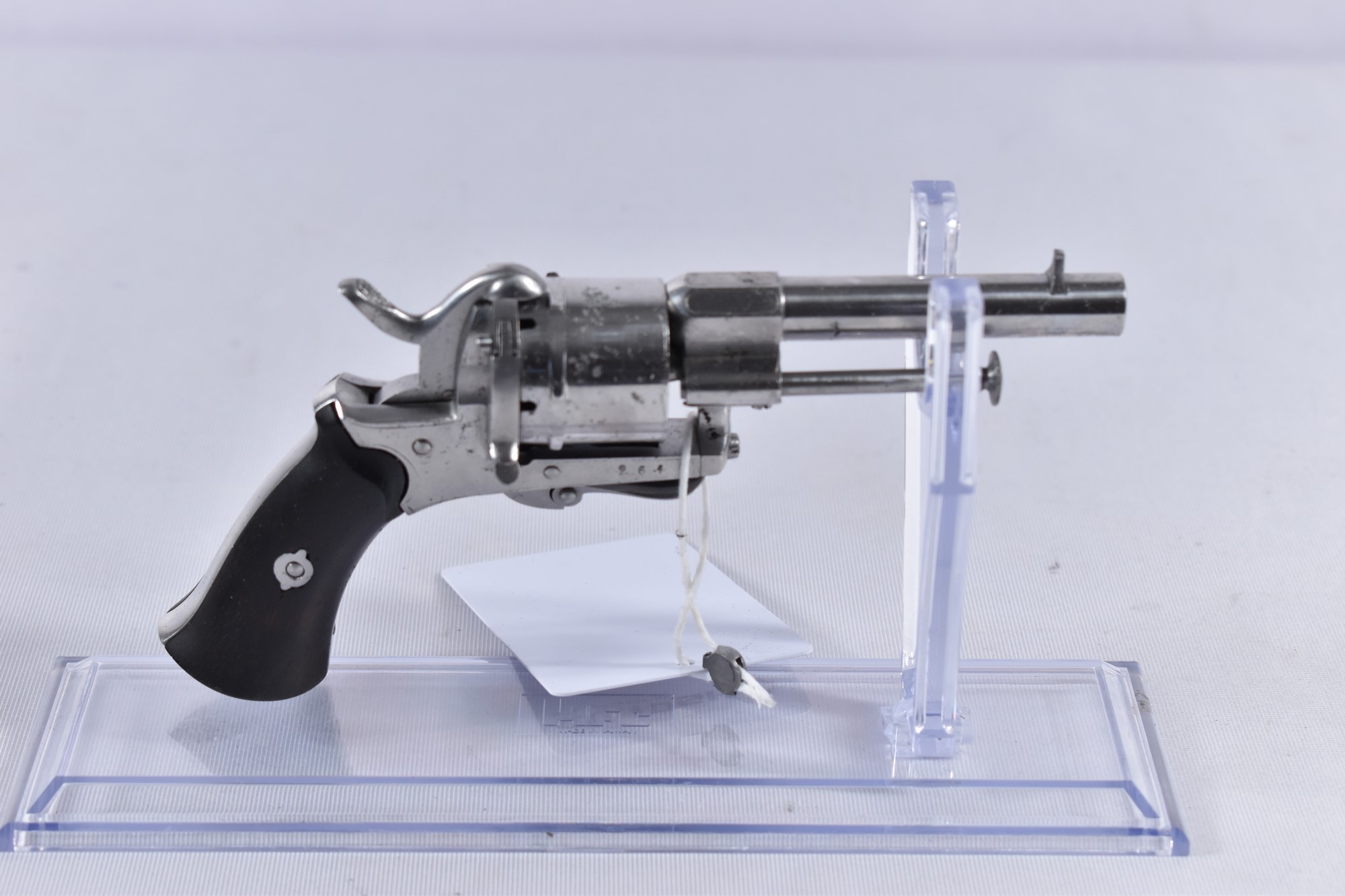 Dieser Lefaucheux im Kaliber 7mm Lefaucheux ist ein kompakter Revolver mit einer Gesamtlänge von 18 cm und einer Lauflänge von 8,4 cm. Das Gewicht beträgt 330 g, und die Magazinkapazität liegt bei 6 Schuss. Der Zustand wird mit 4 bewertet, was deutliche Gebrauchsspuren und eine moderate bis hohe Schussbelastung bedeutet. Die Griffschalen bestehen aus Holz.