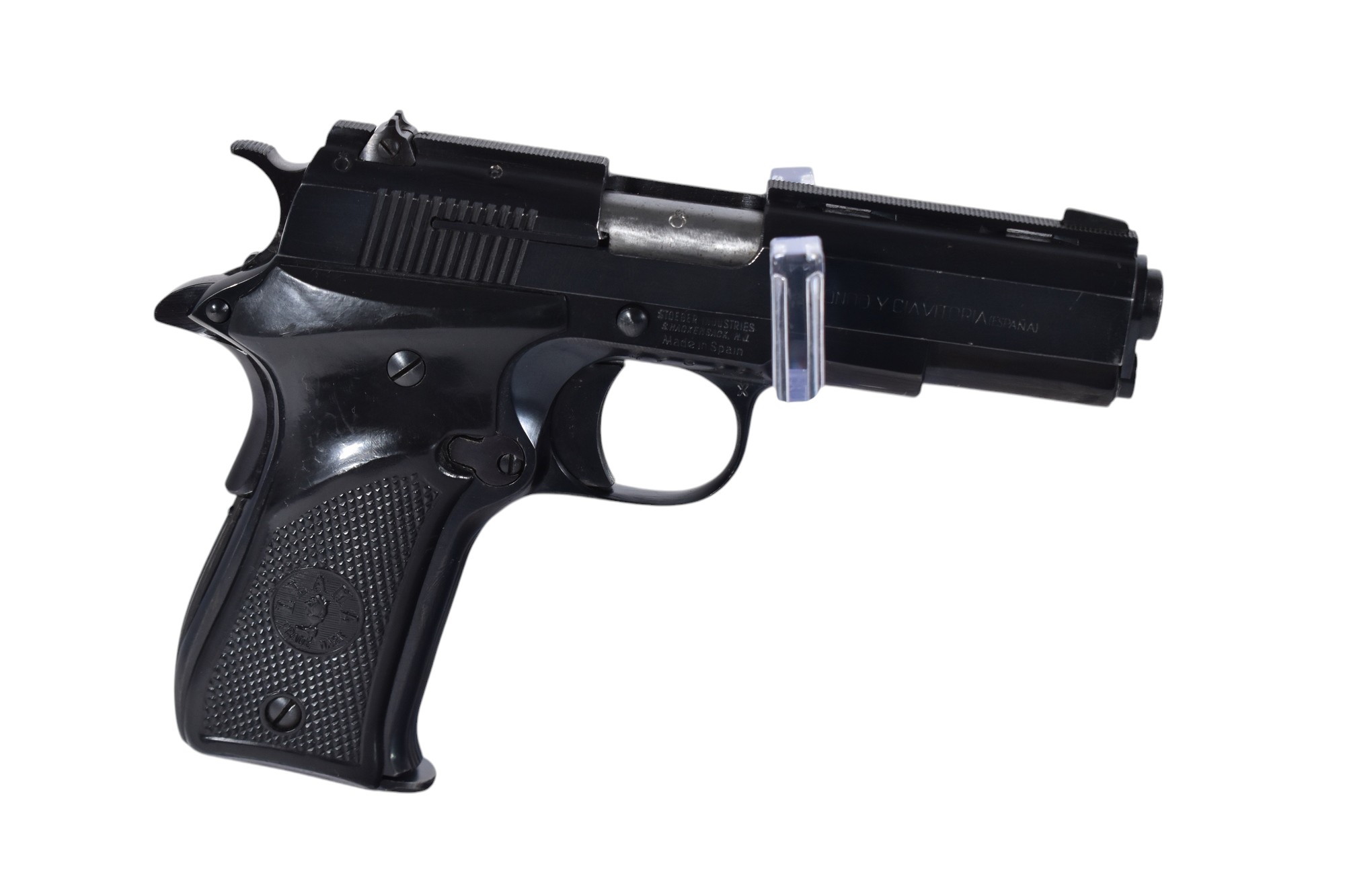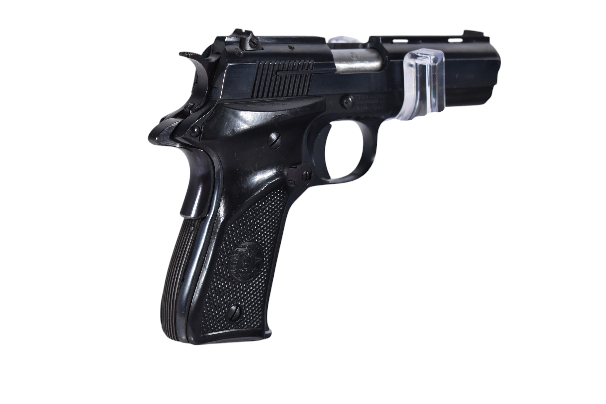 Die Pistole Llama im Kaliber .22lr hat eine Lauflänge von 9 cm und wiegt 0,67 kg. Der Zustand wird mit Note 2-3 bewertet, was auf normale Gebrauchsspuren mit mittelstarken Dellen oder leichten Kratzern an der Brünierung hinweist. Die Waffe wird mit einem Magazin geliefert.