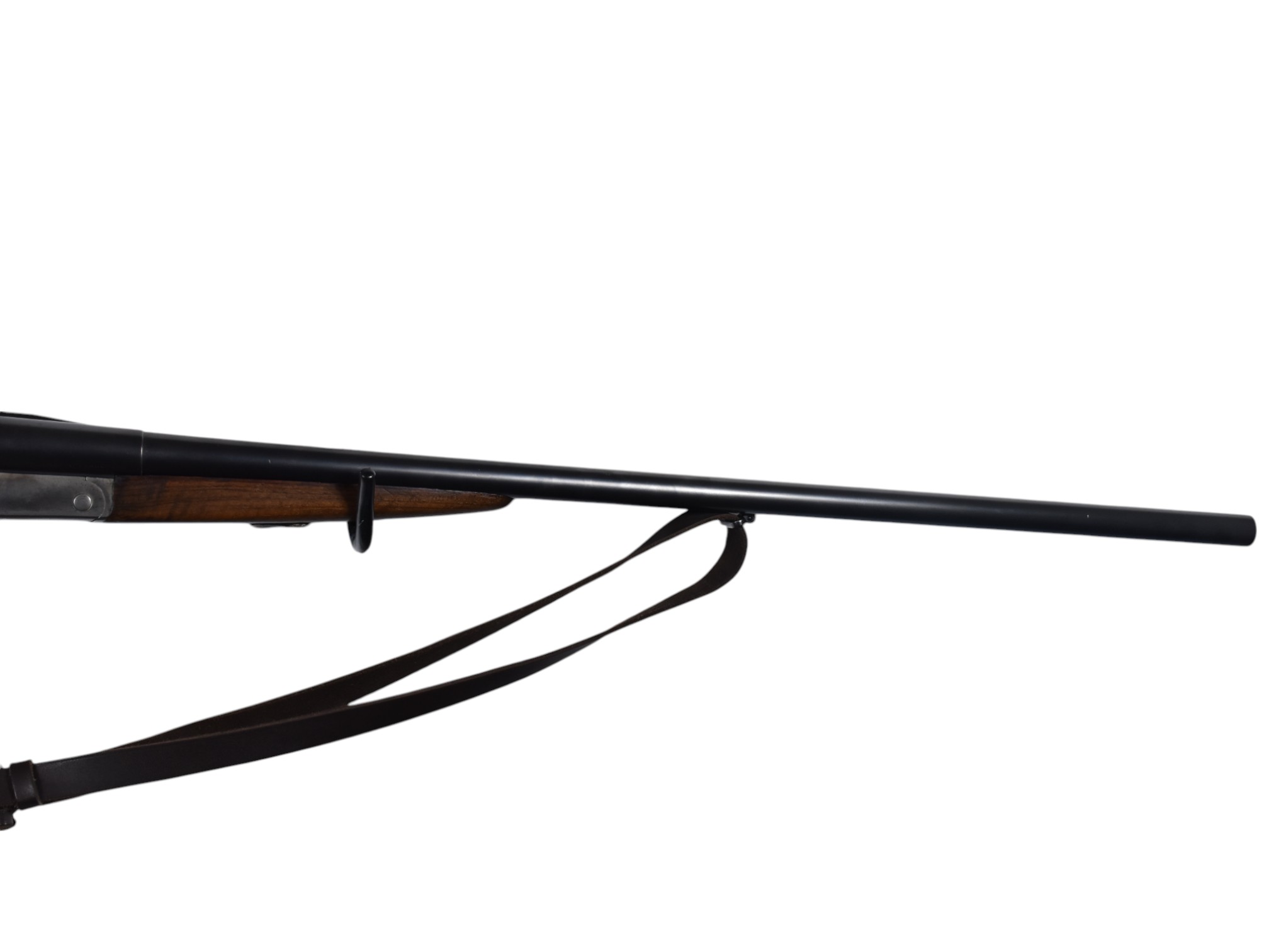 Diese Manufrance Brevete Einzelladerflinte im Kaliber 16/70 hat eine Gesamtlänge von 112 cm, eine Lauflänge von 70 cm und eine Schaftlänge von 36 cm. Der allgemeine Zustand liegt zwischen den Stufen 2 und 3, was auf normale Gebrauchsspuren mit mittelstarken Dellen sowie leichten Kratzern hinweist. Die Brünierung befindet sich in einem ordentlichen Zustand. Am Schaft sind einige Dellen vorhanden, außerdem ist ein Riemen montiert. Die Zustandseinschätzung dient als generelle Orientierung, einzelne Abweichungen sind möglich und nicht jeder Schaden oder jede Nutzungsspur muss wie beschrieben vorhanden sein.