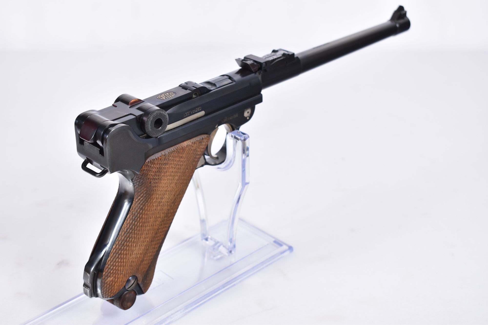 Diese Mauser Lange Pistole 08 im Kaliber 9mm Luger ist ein besonderes Erinnerungsmodell und ein echtes Sammlerstück. Mit einer Lauflänge von 19,7 cm und den stilvollen Holzgriffschalen bietet die Waffe nicht nur historische Bedeutung, sondern auch hochwertige Verarbeitung. Der Beschuss erfolgte 1986. Zum Lieferumfang gehören neben zwei Magazinen auch ein Putzstock, ein Schaft, ein Schlüssel für die verstellbare Visierung sowie ein hochwertiger Holzkoffer mit Schlüssel. Der Zustand der Pistole ist gut und entspricht der Sammlungskategorie.