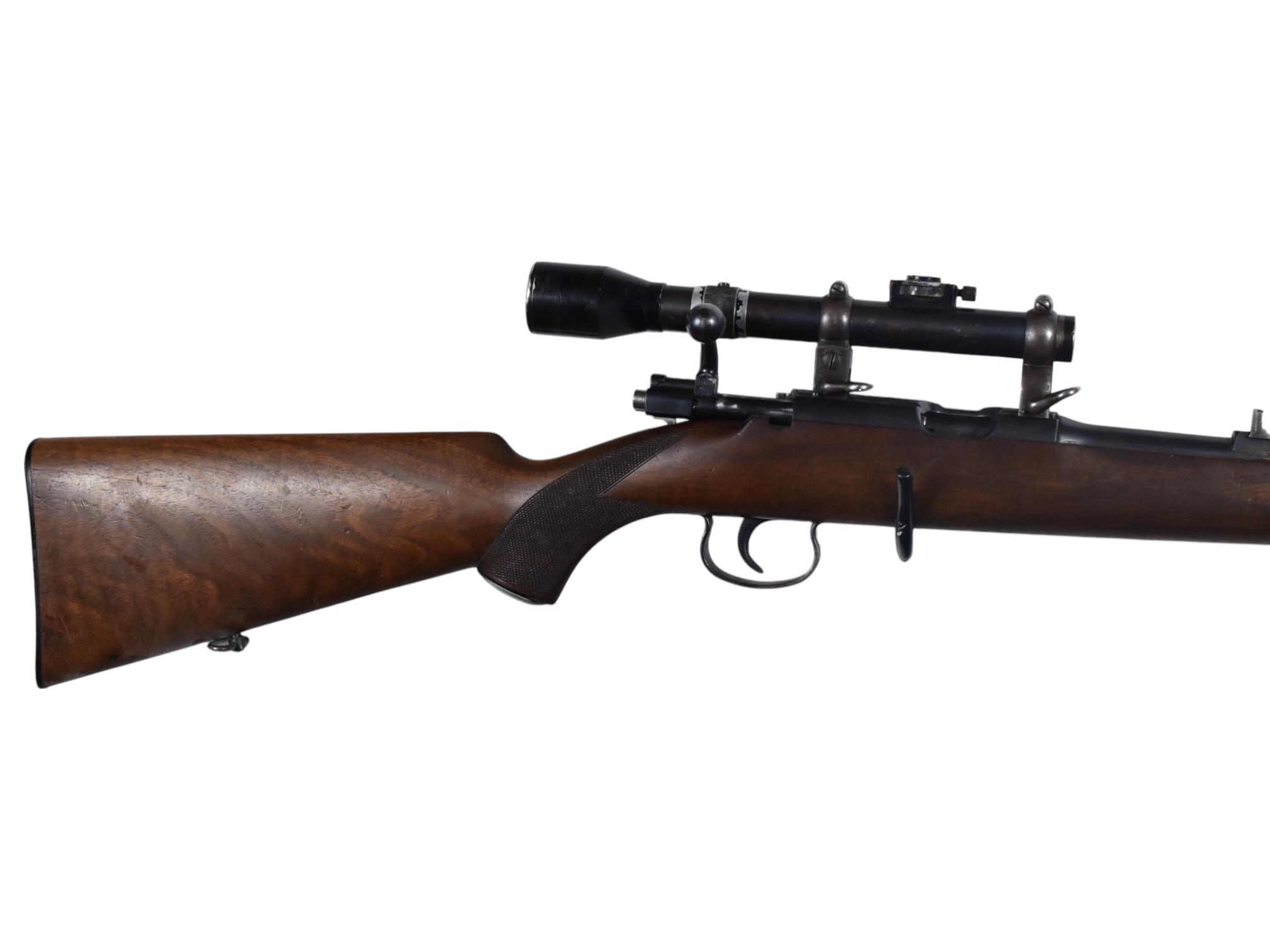 Diese Mauser Repetierbüchse im Kaliber .22 lr befindet sich in einem Zustand zwischen Stufe 2 und 3, was auf normale Gebrauchsspuren mit leichten bis mittleren Dellen oder Kratzern hinweist. Die Waffe ist mit einem Zielfernrohr aus Stahl ausgestattet, das ein Absehen 1 und vermutlich eine vierfache Vergrößerung besitzt. Zusätzlich ist eine offene Visierung vorhanden. Ein gültiger Beschuss ist nicht vorhanden, daher ist die Abgabe ausschließlich an Händler oder Sammler mit entsprechender Berechtigung möglich. Die Zustandseinschätzung dient als generelle Orientierung, einzelne Abweichungen sind möglich und nicht jeder Schaden oder jede Nutzungsspur muss wie beschrieben vorhanden sein.