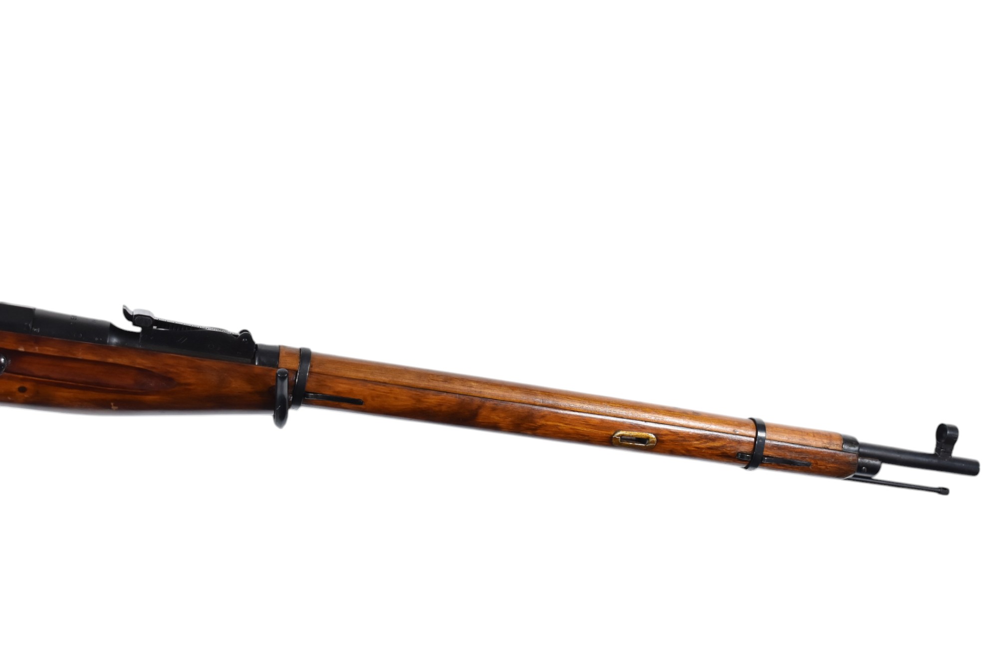 Dieser Mosin Nagant 1891 im Kaliber 7,62x54R verfügt über eine Gesamtlänge von 123 cm, eine Lauflänge von 73 cm und eine Schaftlänge von 35 cm. Das Gewicht beträgt 4,1 kg. Der Beschuss der Waffe stammt aus dem Jahr 2017.
