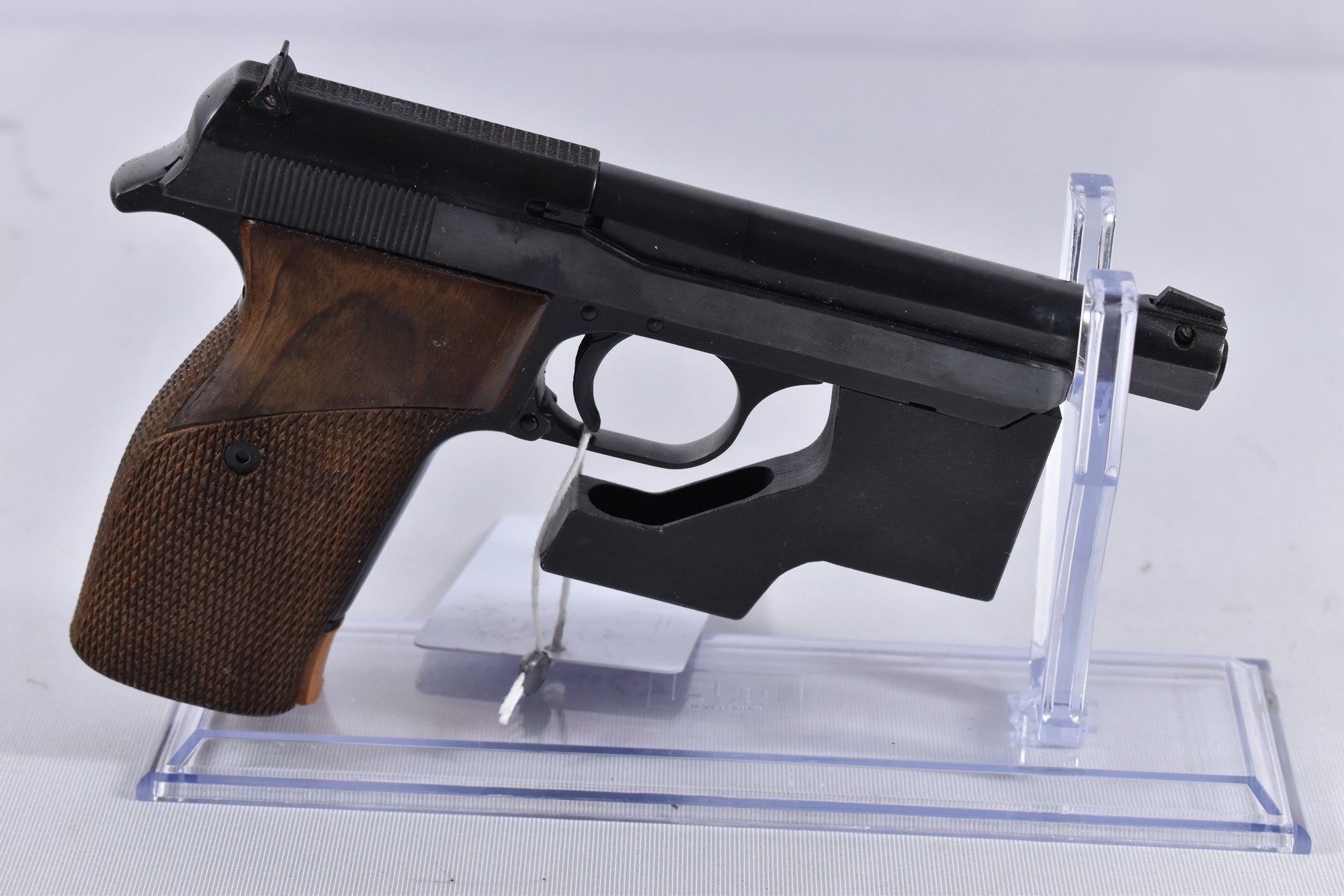 Diese Norinco TT Olympia Pistole im Kaliber .22lr hat eine Gesamtlänge von 20,5 cm und eine Lauflänge von 12 cm. Sie wiegt 1,0 kg und befindet sich im Zustand 2, was leichte Gebrauchsspuren bedeutet. Die Pistole hat Holzgriffschalen und verfügt über ein Laufgewicht sowie einen gültigen Beschuss von 2004.