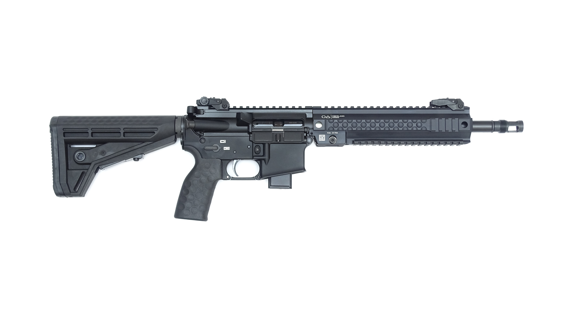 Das Gehäuse ist kompatibel mit den OA-15 Modellen im Kaliber .223 Remington somit können zwei Kaliber mit nur einem Eintrag auf der Waffenbesitzkarte verwendet werden. Der OA M4-Schaft ist in der Länge verstellbar und trägt zur optimalen Anpassung an den Schützen bei. Ein Mündungsgewinde M15x1 samt KDA Mündungsfeuerdämpfer rundet das professionelle Setup ab. Hinzu kommt ein modernes BUIS-System (Back-Up Iron Sights), das bei Bedarf durch eine Optik ergänzt werden kann.