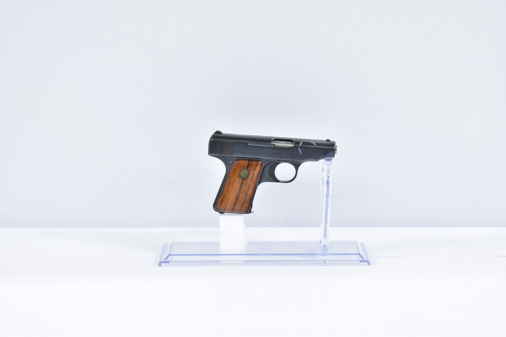 Diese Ortgies Pistole im Kaliber 6,35mm Browning hat eine Gesamtlänge von 12,5 cm und eine Lauflänge von 6,5 cm. Der Zustand der Waffe wird als 1 eingestuft, was bedeutet, dass sie wie fabrikneu ist, ohne Gebrauchsspuren und mit maximal 20 abgegebenen Schüssen. Die Schäftung besteht aus Holz. Die Pistole ist ein halbautomatisches Modell von Ortgies Patent, hergestellt von Deutsche Werke Erfurt, und hat einen gültigen Beschuss.