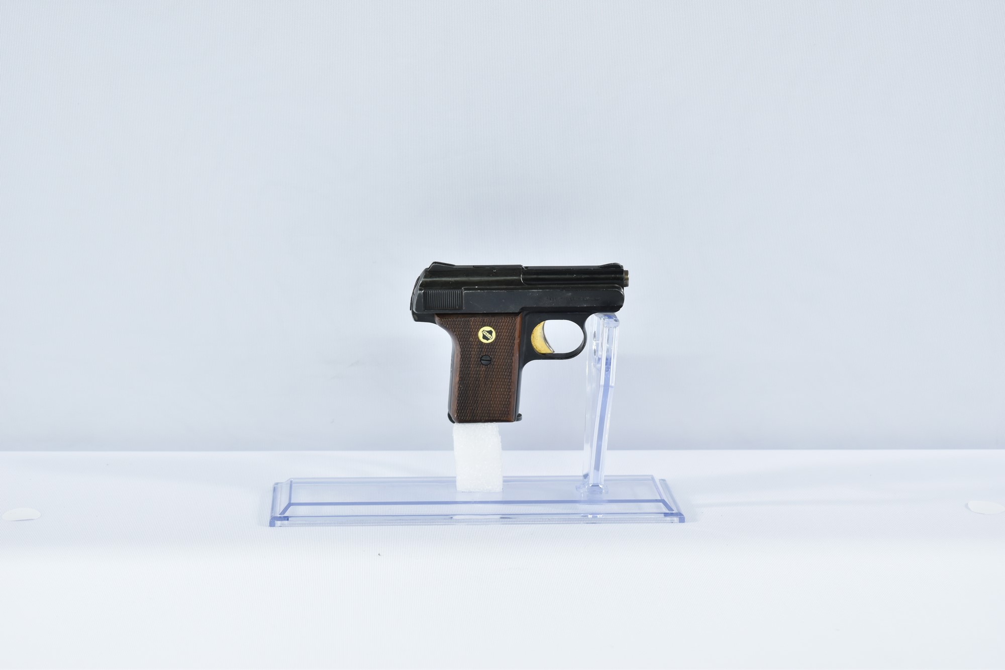 Diese Reck P8 Pistole im Kaliber 6,35mm Browning hat eine Gesamtlänge von 11,5 cm und eine Lauflänge von 5,5 cm. Die Griffschalen sind aus Holz gefertigt. Der Zustand der Pistole wird als 2-3 bewertet, was normale Gebrauchsspuren und möglicherweise mittelstarke Dellen oder Kratzer an der Brünierung bedeutet. Sie wurde in Westdeutschland hergestellt und 1970 beschossen.