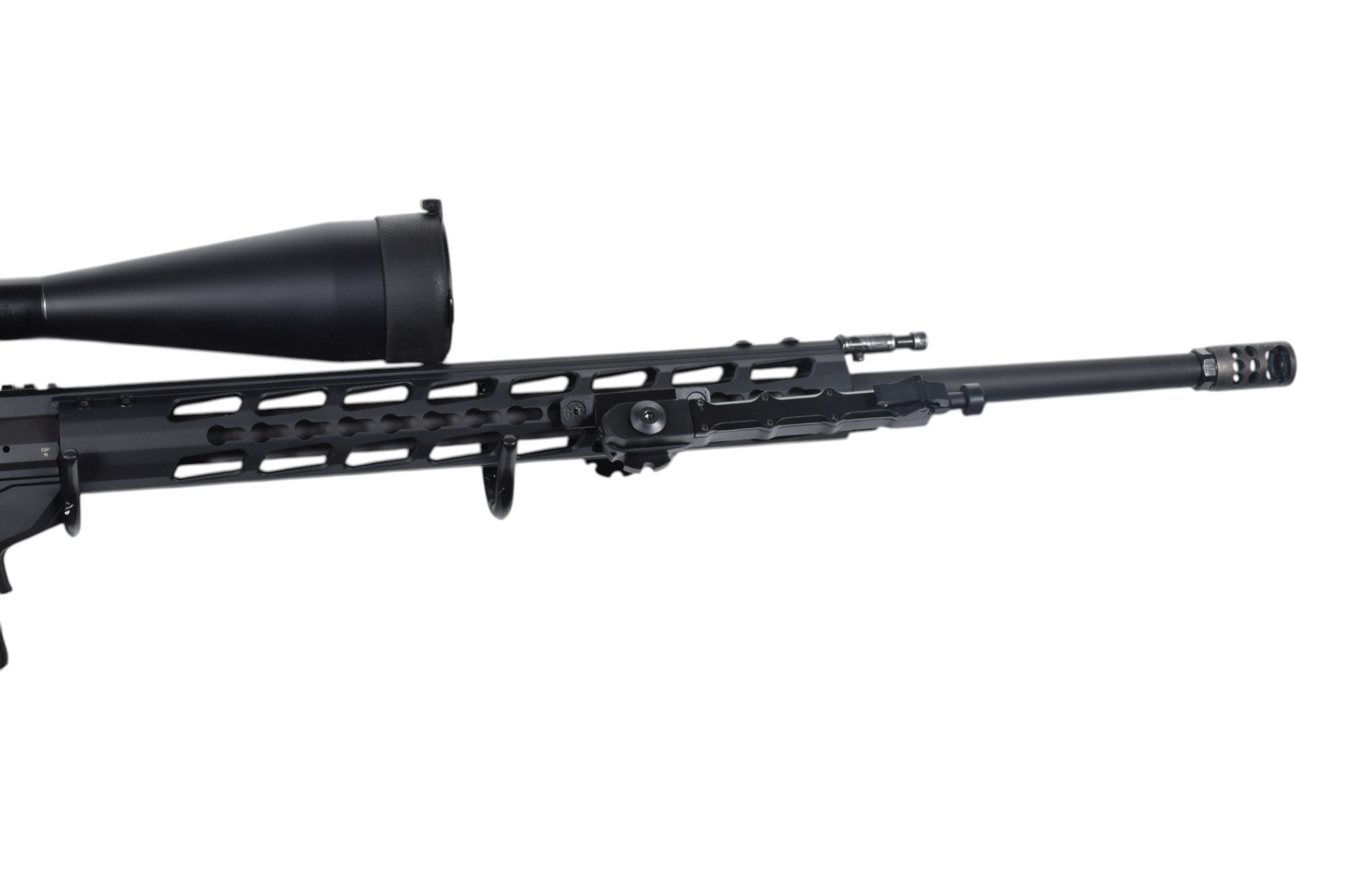 Diese Ruger Precision Repetierbüchse im Kaliber 6.5 Creedmoor hat eine Gesamtlänge von 115 cm, eine Lauflänge von 68 cm sowie eine Schaftlänge von 34 cm. Die Waffe ist mit einem Zielfernrohr 10-50×60 ausgestattet. Der Schaft ist verstellbar, zudem ist ein Zweibein montiert.