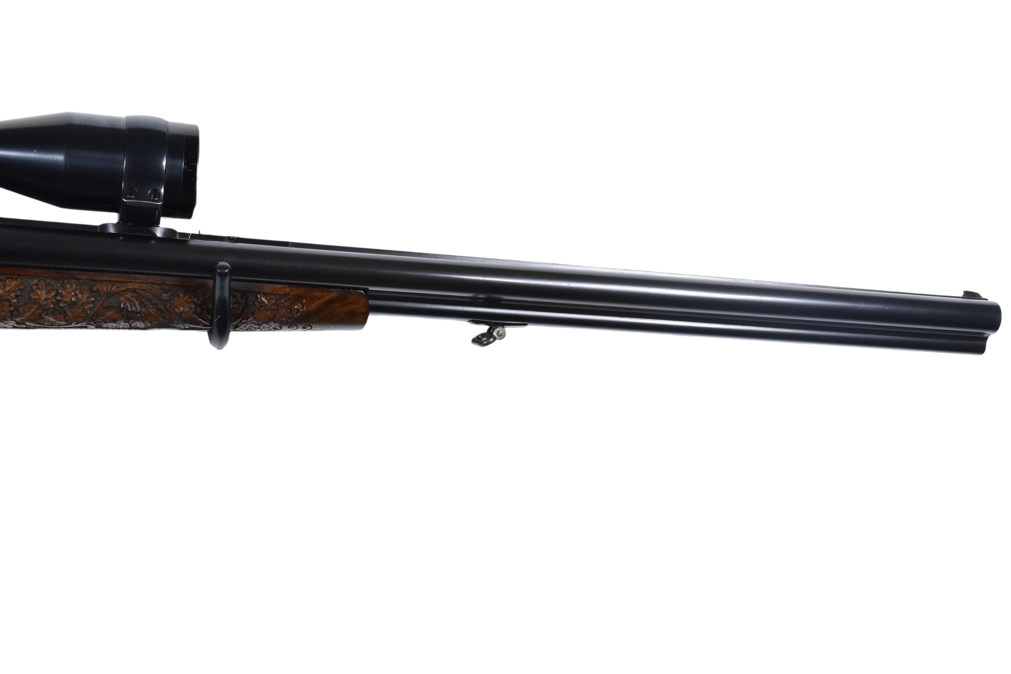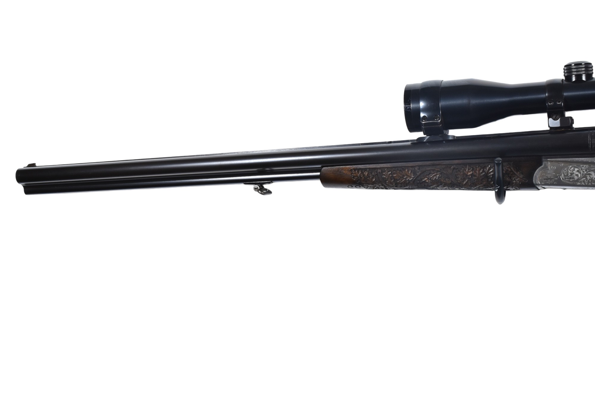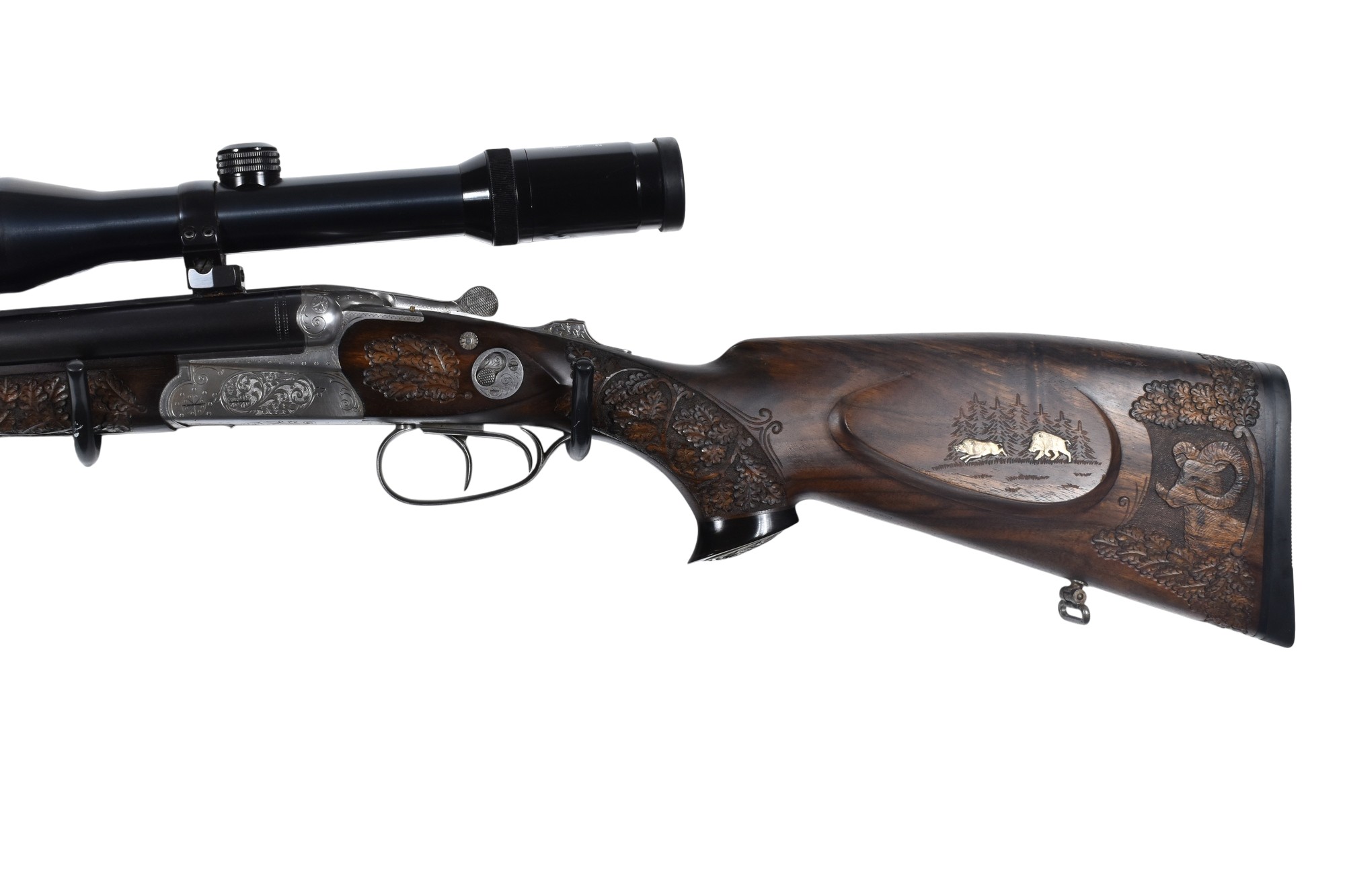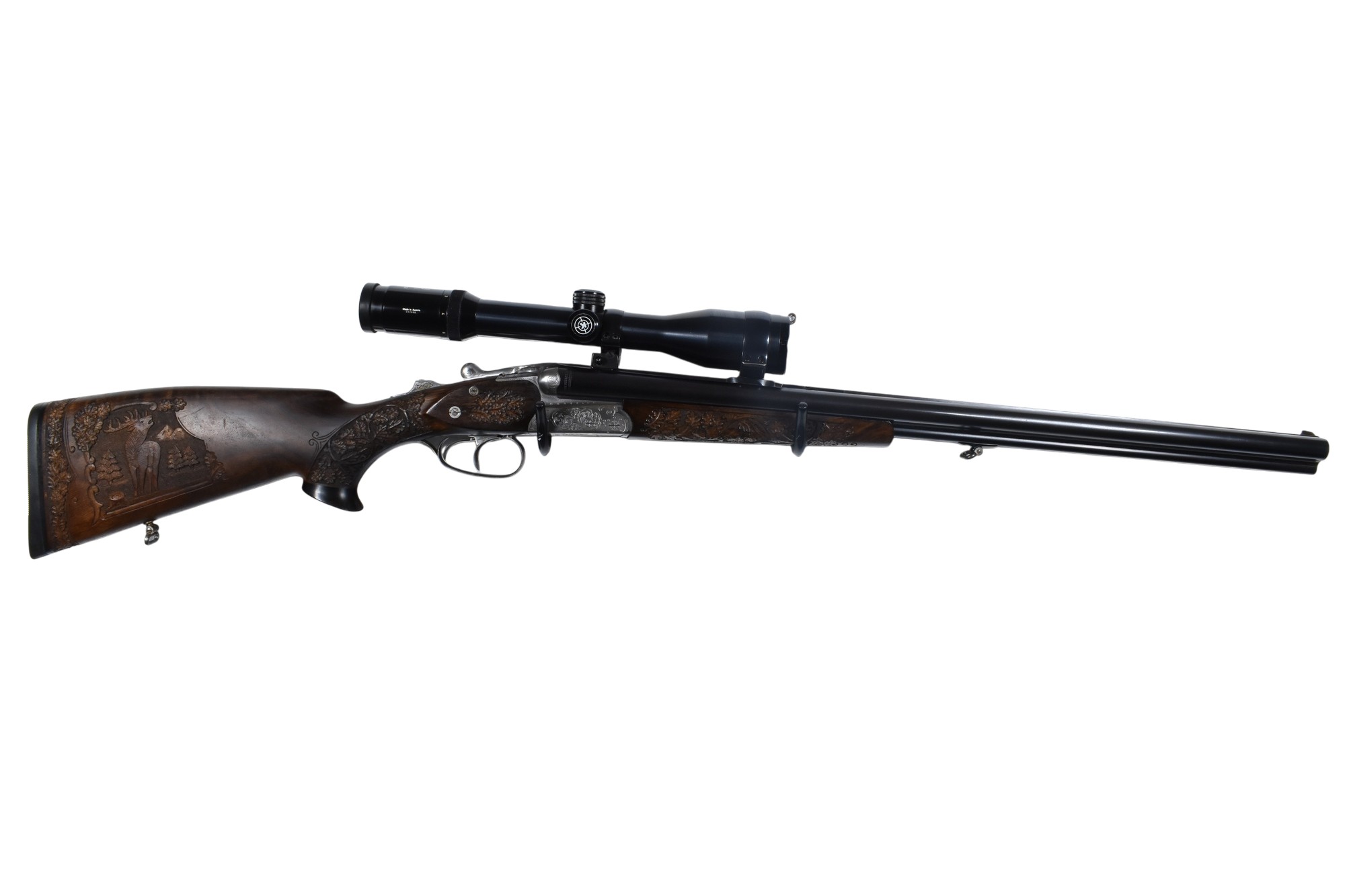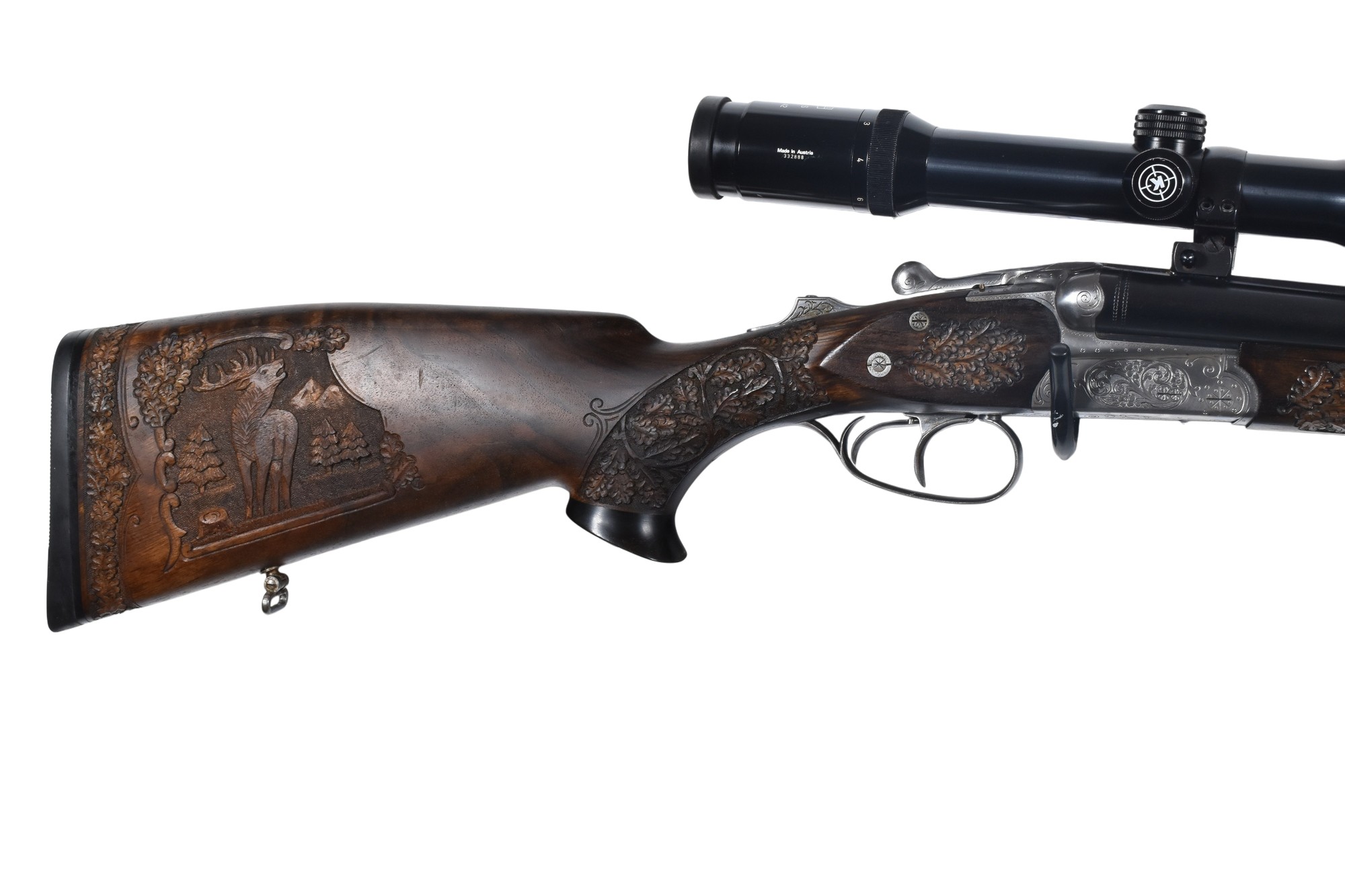 Dieser Simson Suhl Modell 32F Drilling im Kaliber .30-06 Springfield und 16/70 hat eine Gesamtlänge von 107 cm, eine Lauflänge von 62,5 cm und eine Schaftlänge von 38 cm. Montiert ist ein Karl Kahles Wien Helia 2,2-9×42 Zielfernrohr mit Absehen 4. Der Schaft ist mit jagdlichen Motiven graviert und mit Bronzeeinlagen verziert. Die Waffe verfügt über einen deutschen Beschuss aus Suhl mit dem Beschussdatum 04/68.