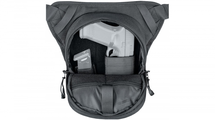 Das Hauptfach enthält zwei per Klett versetzbare Halter. Während der Waffenhalter ebenfalls per Klett auf den jeweiligen Umfang der Waffe einstellbar ist, besteht der Magazinhalter aus einer Elastikschlaufe, die auch doppelreihige Magazine problemlos aufnimmt. Durch die große Klettfläche im Hauptfach lassen sich die beiden Halter problemlos für unterschiedliche Waffengrößen und auch für linksseitiges Tragen umsetzen.