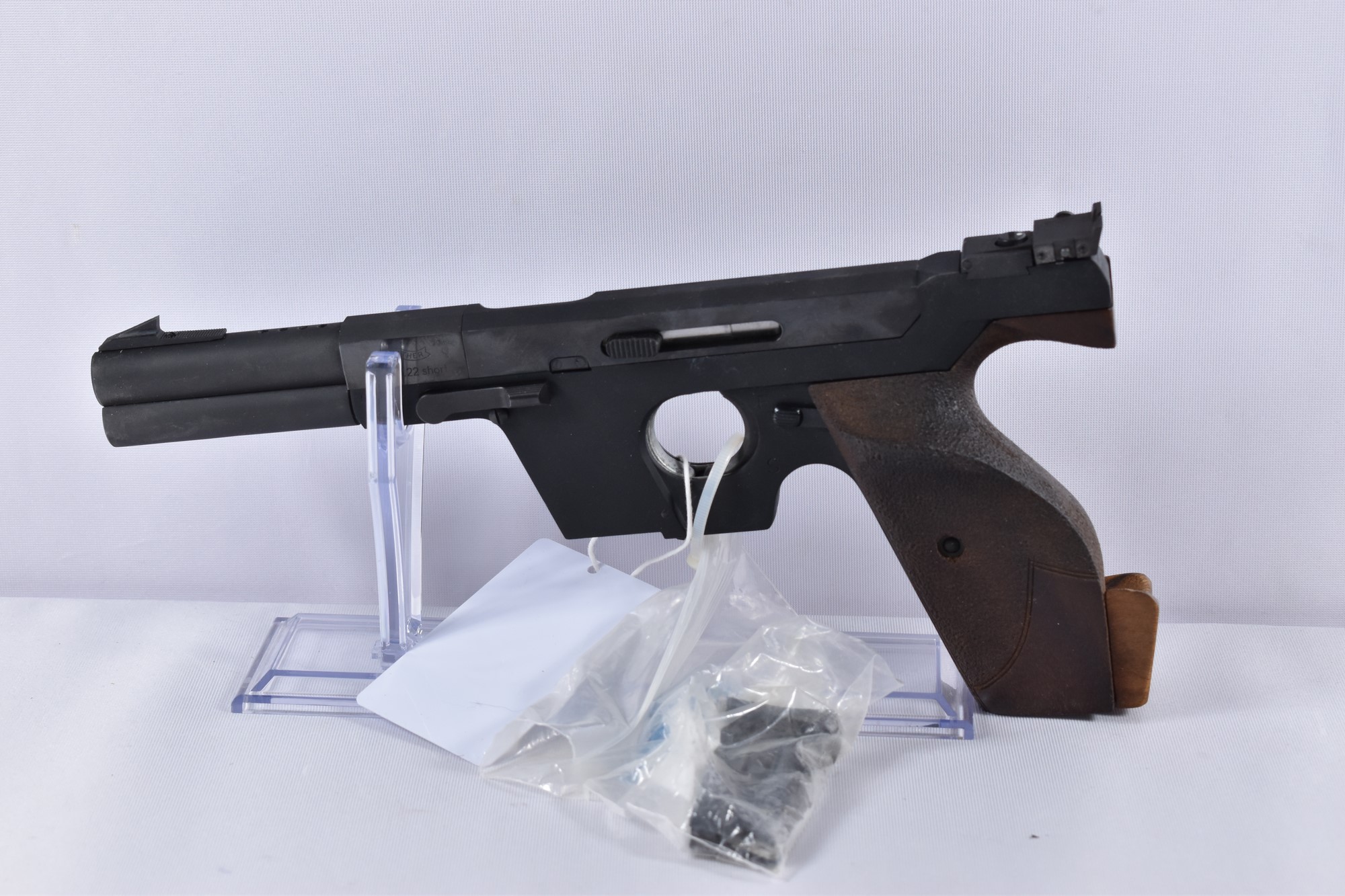Diese Walther OSP Pistole im Kaliber .22 Short hat eine Gesamtlänge von 30 cm und eine Lauflänge von 11,5 cm. Sie wiegt 1,096 kg und hat eine Magazinkapazität von 5 Schuss. Der Zustand der Waffe wird als 1 eingestuft, was bedeutet, dass sie wie fabrikneu ist. Die Schäftung besteht aus Holz und sie hat ein Laufgewicht sowie einen Beschuss von 1970.