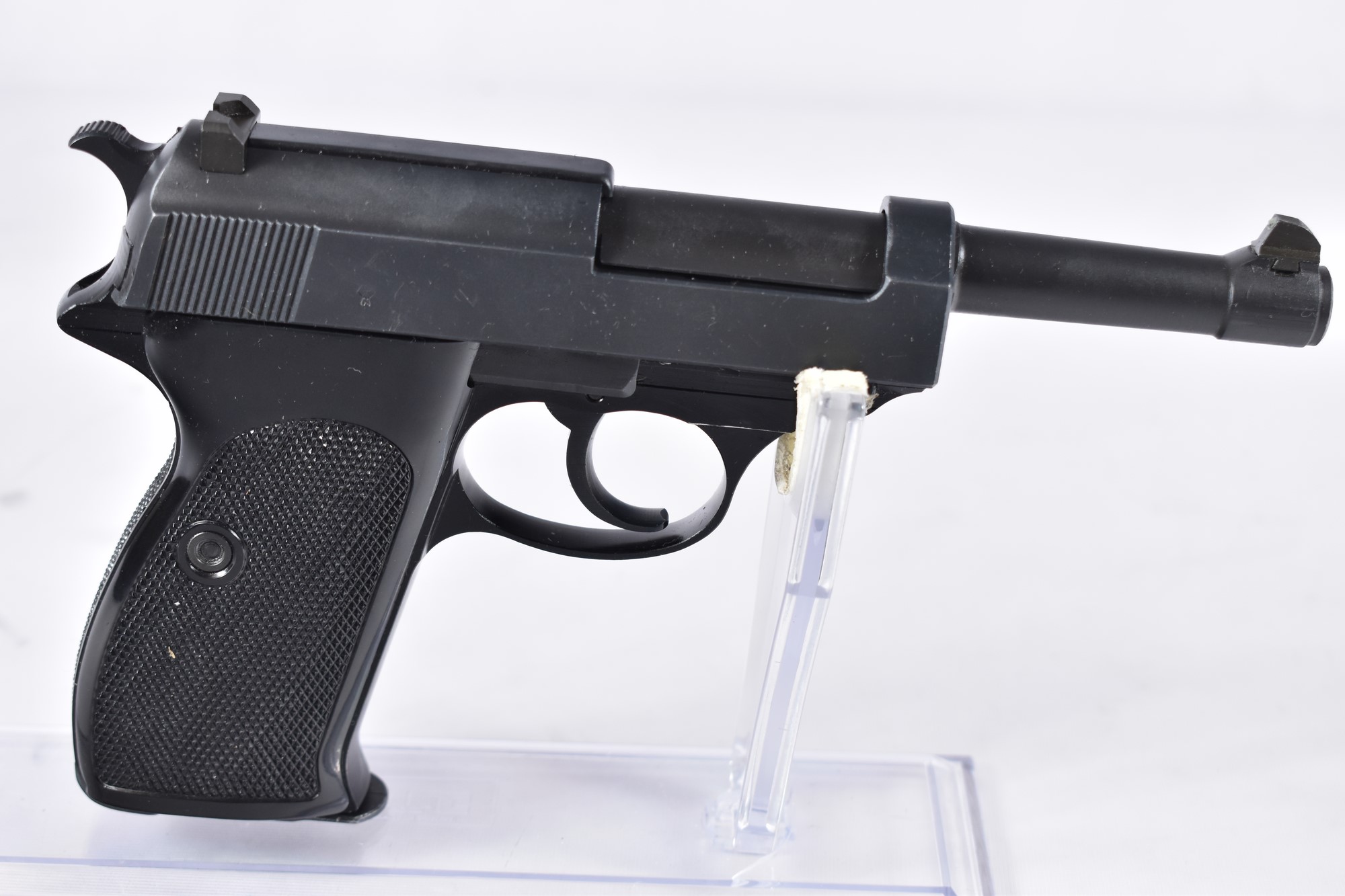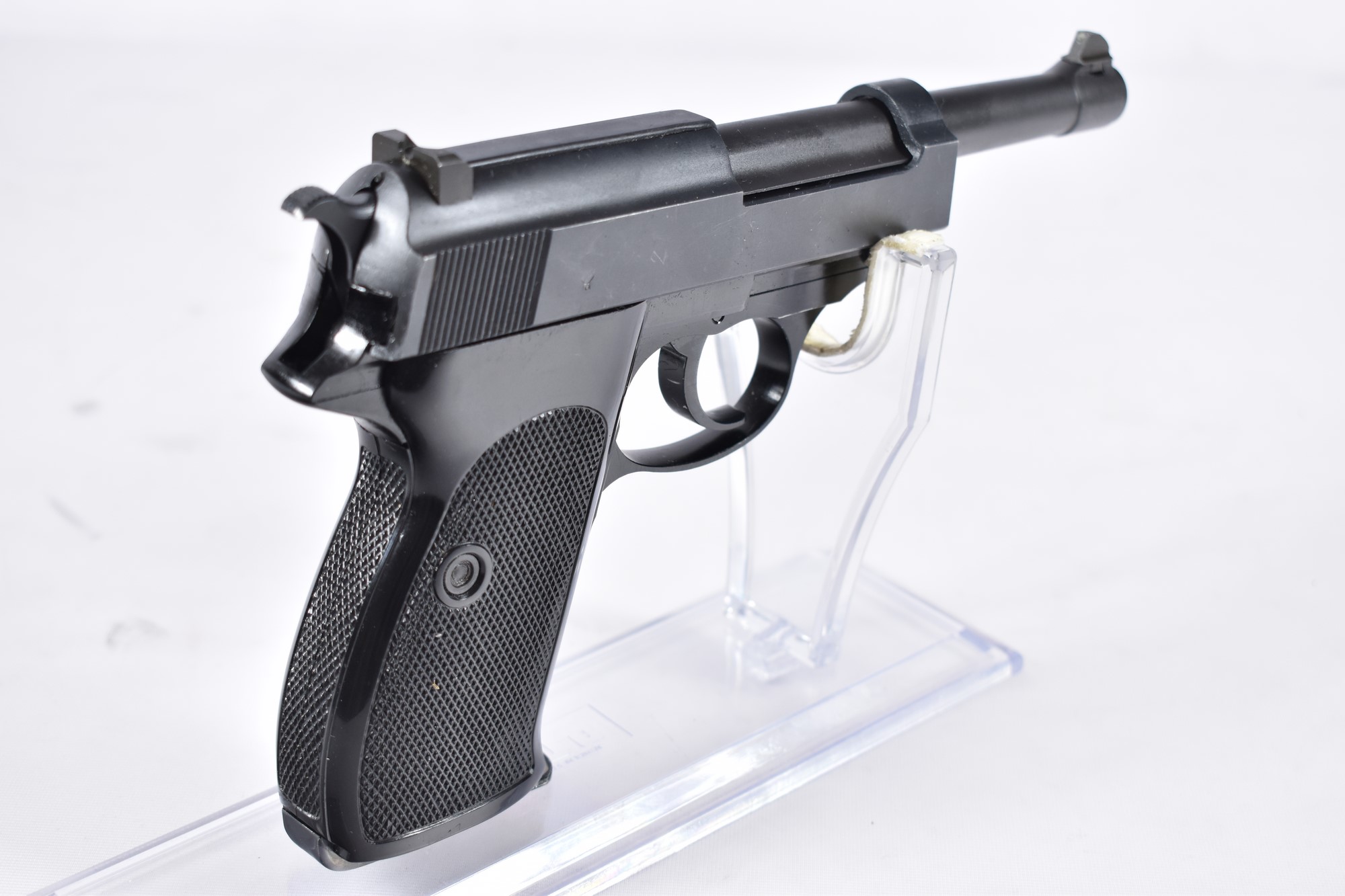 Diese Walther P 38 9mm Luger Pistole hat eine Gesamtlänge von 22 cm und eine Lauflänge von 12,5 cm. Das Gewicht beträgt 0,788 kg. Die Waffe befindet sich in einem Zustand von 2, was normale Gebrauchsspuren sowie leichte bis mittelstarke Dellen und/oder Kratzer an der Brünierung bedeutet. Die Schäftung besteht aus Kunststoffgriffschalen. Das Beschussdatum ist 1969.