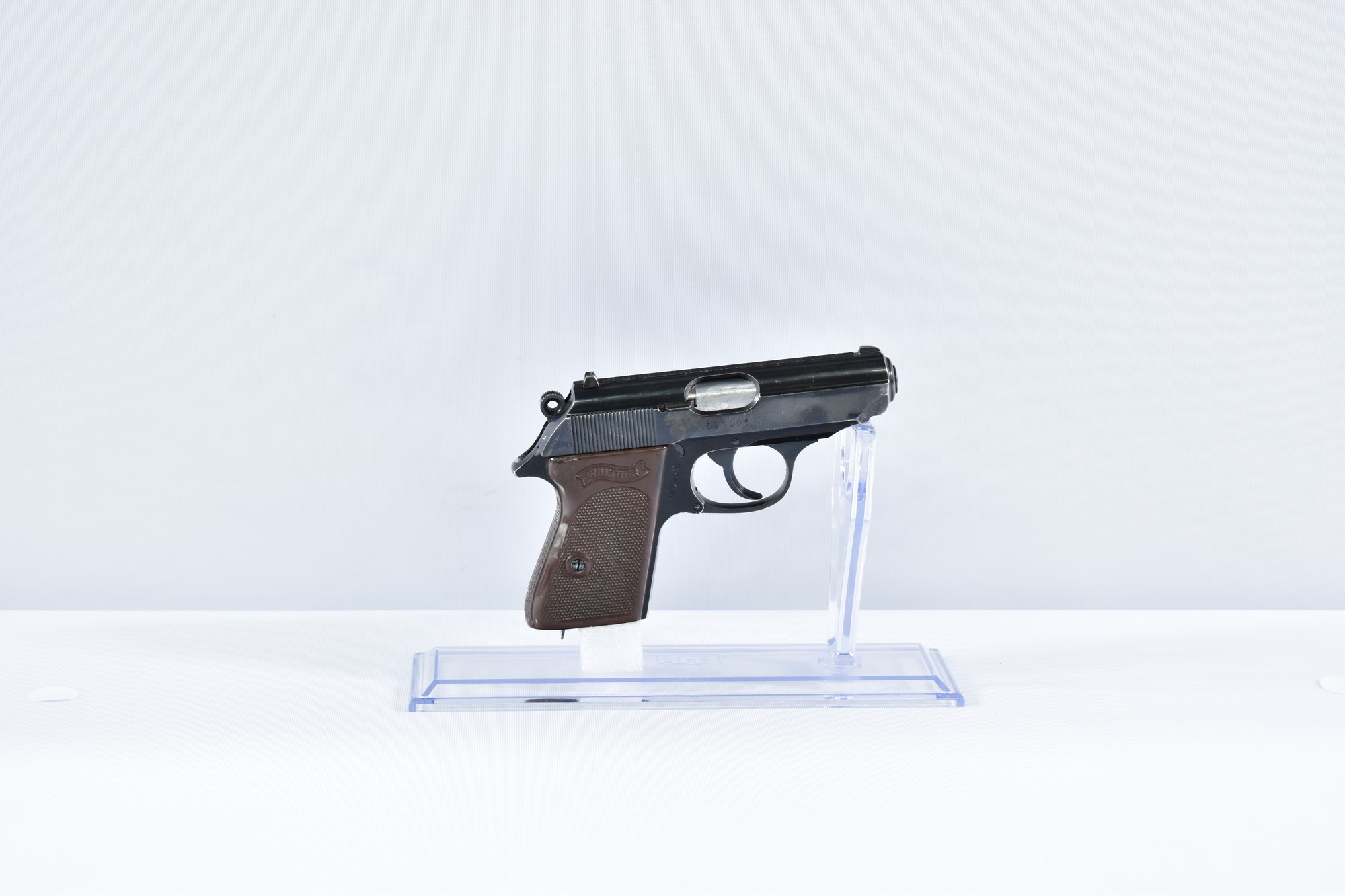 Diese Walther PPK Pistole im Kaliber 7,65mm Browning hat eine Gesamtlänge von 16 cm und eine Lauflänge von 5,5 cm. Sie verfügt über eine Magazinkapazität von 7 Schuss. Die Griffschalen sind aus Kunststoff gefertigt. Der Zustand der Pistole wird als 2- bewertet, was normale Gebrauchsspuren und möglicherweise leichte bis mittelstarke Dellen oder Kratzer an der Brünierung bedeutet. Die Pistole wurde 1972 beschossen.