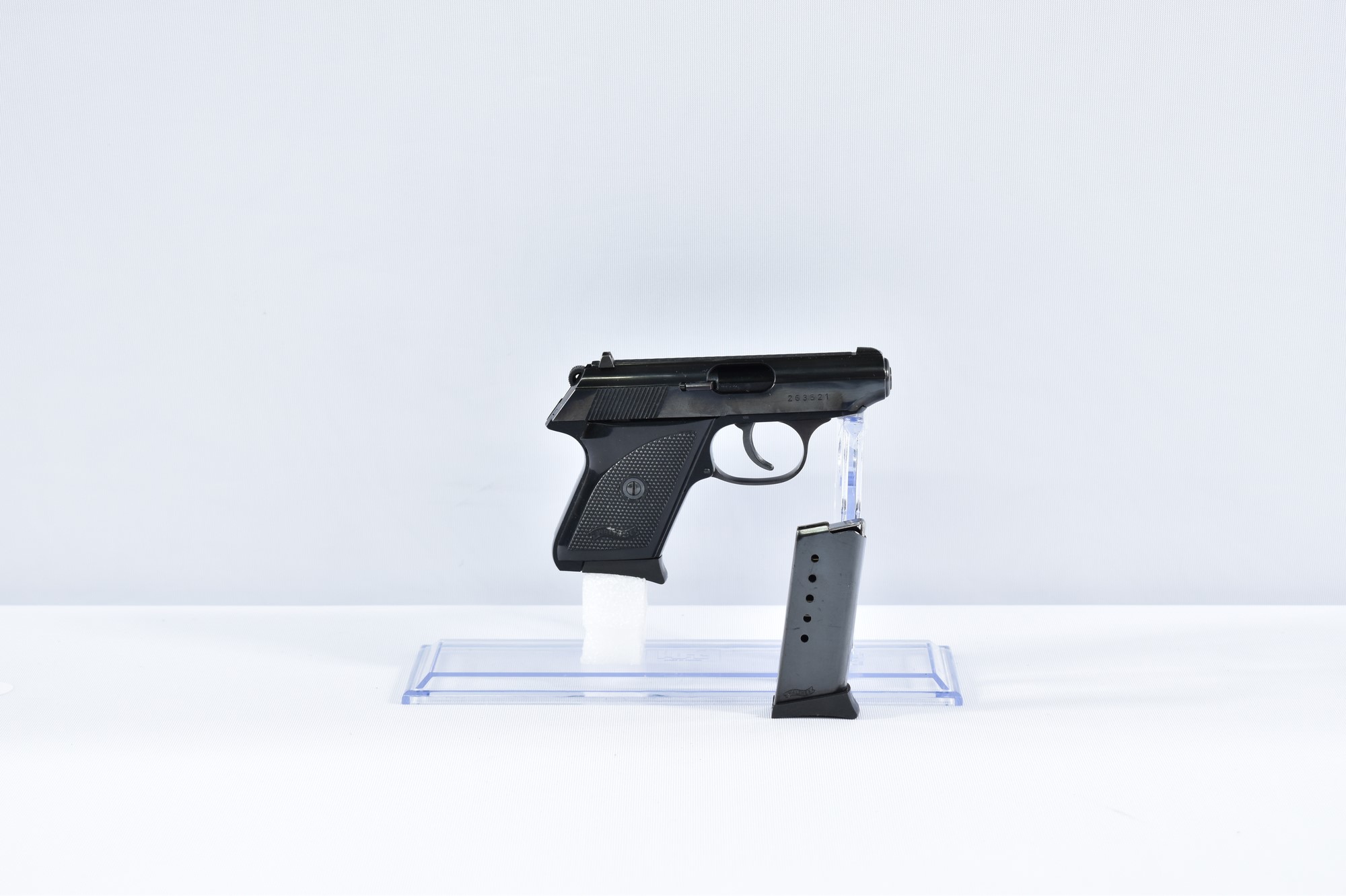 Diese Walther TPH Pistole im Kaliber 6,35mm Browning hat eine Gesamtlänge von 13,5 cm und eine Lauflänge von 6,5 cm. Der Zustand der Waffe wird als 1- eingestuft, was sehr leichte Gebrauchsspuren bedeutet. Die Schäftung besteht aus Kunststoff. Die Pistole wird mit Originalverpackung, Anleitung und einem Ersatzmagazin geliefert.