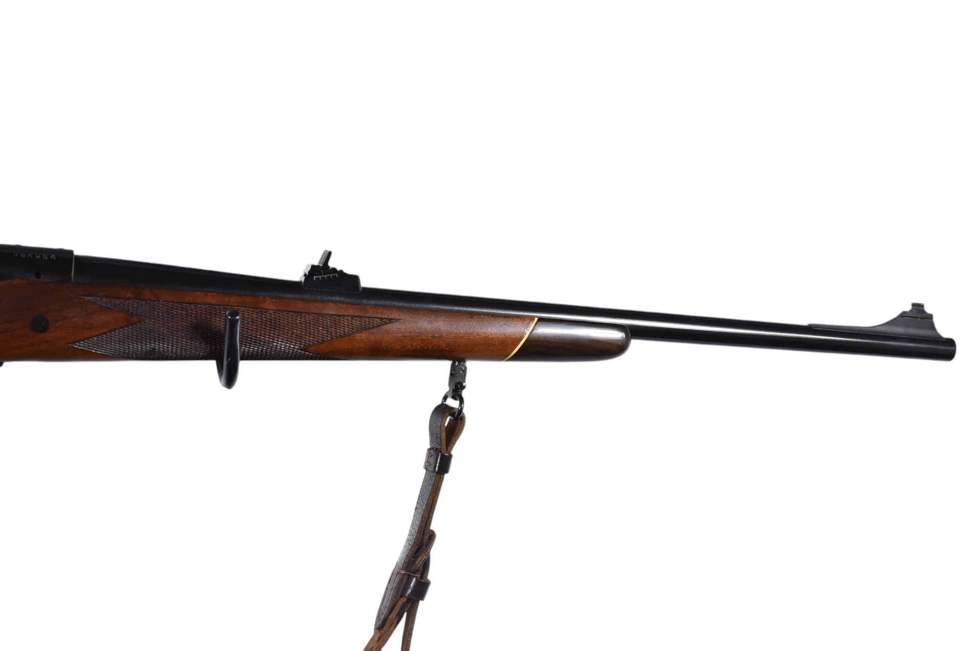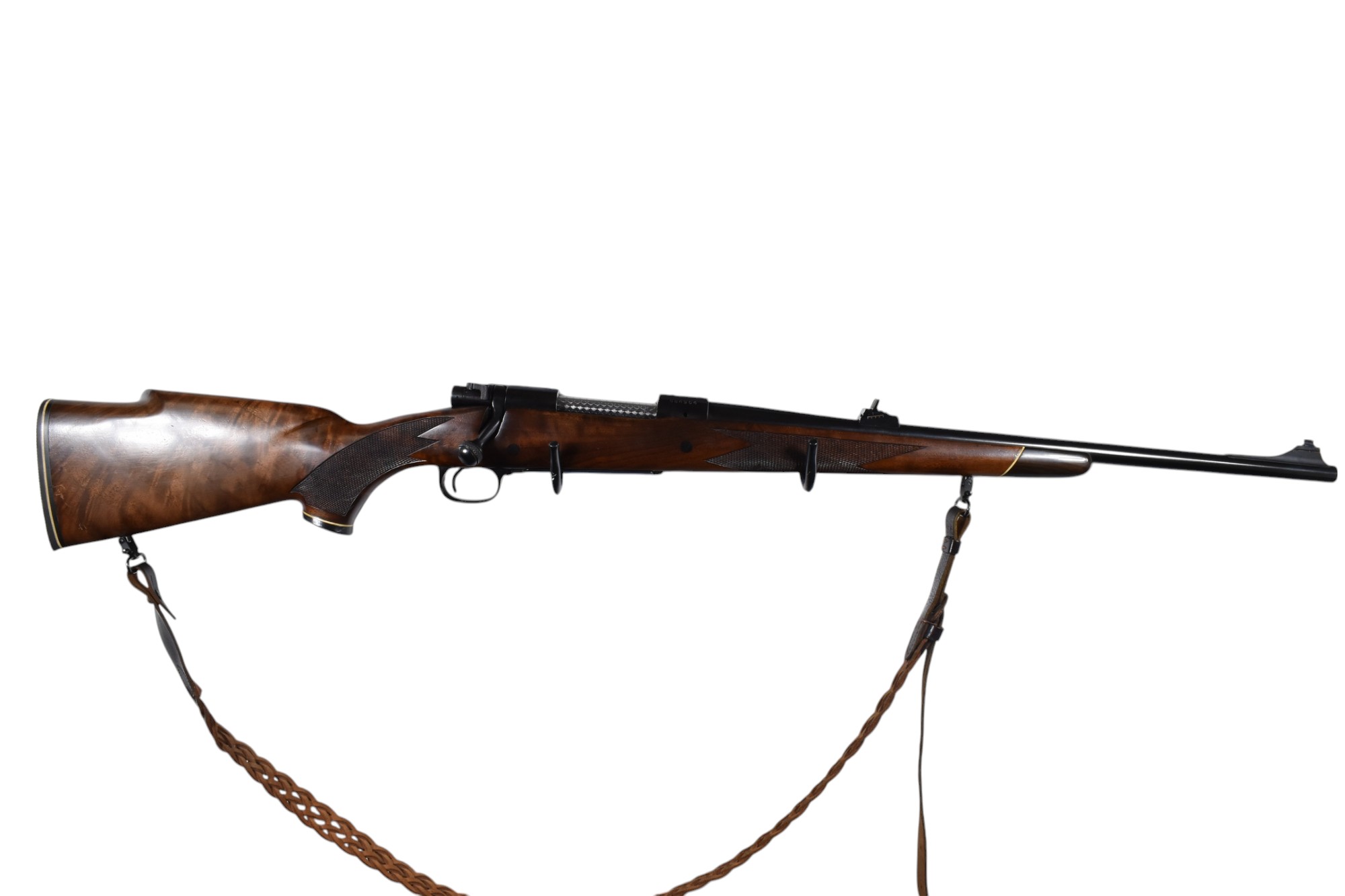 Diese Winchester Modell 70 im Kaliber .30-06 Springfield ist eine klassische Repetierbüchse mit einer Gesamtlänge von 108 cm, einer Lauflänge von 58 cm und einer Schaftlänge von 34 cm. Die Waffe ist mit einem geflochtenen Lederriemen ausgestattet und trägt einen Beschuss aus dem Jahr 1969. Der Zustand wird mit der Note 2 angegeben, was auf normale Gebrauchsspuren hinweist, wie leichte bis mittelstarke Dellen am Schaft oder an den Griffschalen sowie mögliche Kratzer an der Brünierung. Diese Einschätzung dient als allgemeine Orientierung nicht jeder Schaden oder jede Nutzungsspur muss exakt wie beschrieben vorhanden sein.